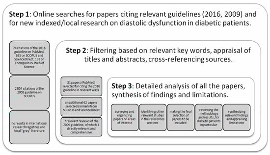 We started from the online text of the 2016 recommendations and investigated all its PubMed citations by mid-March 2019. There were seventy-four papers in English citing the new guidelines from a range of medical perspectives. The titles and abstracts were screened to select those papers relevant for the diagnosis, classification, and treatment of LVDD. Thirty-one papers were selected based on their use and/or appraisal of the new algorithm, the inclusion of diabetic patients in the studied cohorts, and the implications for clinical practice, etc.