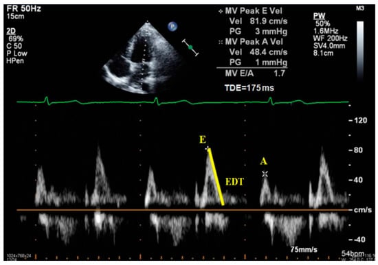 - Nagueh, S.F.; Smiseth, O.A.; Appleton, C.P.; Byrd, B.F.; Dokainish, H.; Edvardsen, T.; Flachskampf, F.A.; Gillebert, T.C.; Klein, A.L.; Lancellotti, P.; et al. Recommendations for the Evaluation of Left Ventricular Diastolic Function by Echocardiography: An Update from the American Society of Echocardiography and the European Association of Cardiovascular Imaging. J. Am. Soc. Echocardiogr. 2016, 29, 277–314. [Google Scholar] [CrossRef]