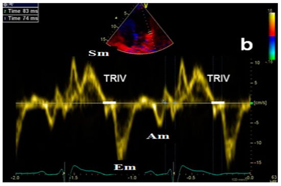 Figure 4. Echocardiographic assessment of isovolumetric relaxation time (IVRT) by Tissue Doppler Imaging (TDI). Am (or A’): late diastolic annular velocity (septal, lateral, and average) via tissue Doppler imaging; Em (or E’): early diastolic annular velocity (septal, lateral, and average) via tissue Doppler imaging; Sm: systolic annular velocity; TRIV: isovolumetric relaxation time. - Tricuspid regurgitation peak velocity (TRpV; Figure 5) with CW (continuous Doppler) on tricuspid regurgitation jet;