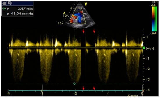Figure 5. Echocardiographic assessment of tricuspid regurgitation peak velocity (TRpV) by continuous Doppler (CW) on tricuspid regurgitation jet. V: velocity; P: gradient (is 4V2). V: specific echocardiographic parameter (it does not mean a measurement data). - S and D wave peak velocity on right superior pulmonary vein flow in pulsed Doppler (Figure 6);