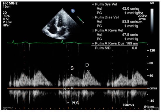 Figure 6. Echocardiographic measurement of S and D wave peak velocity by pulsed Doppler on right superior pulmonary vein flow. D: peak velocity of diastolic wave: RA: peak velocity of reverse atrial wave; peak S: peak velocity of systolic wave. - Left atrial size assessed by area or better by left atrium volume (indexed) (LAVi; Figure 7).
