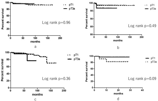 Oncological outcomes of pathological T3 upstaging and pathological T1 patients. (a) Overall survival, (b) Cancer-specific survival, (c) Recurrence-free survival, (d) Two-year recurrence-free survival).