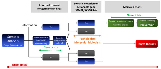 At the time of somatic analysis, clinicians should give their patients clear information about the possibility and benefit of knowing a germline mutation for themselves and their relatives. A written informed consent for this issue should be obtained (Figure 1). After clear information is given, some patients may not want to address the germline issue and thus may only want access to the somatic information for a personalized therapeutic goal (Figure 1). Patients who require additional information on preventive strategies may be referred to geneticist consultations before the tumor test. In case of a tumor-detected mutation on actionable cancer genes listed by the American College of Medical Genetics or SFMPP [6,7], patients should be referred to a geneticist for constitutional analysis and specific counselling, support, and care.