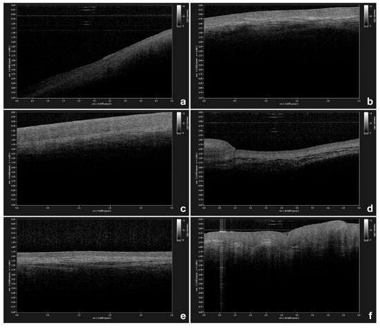 (a) Optical coherence tomography (OCT) image of healthy gingiva; (b) OCT image of healthy labial mucosa; (c) OCT image of healthy buccal mucosa; (d) OCT image of healthy ventral surface of the tongue; (e) OCT image of healthy floor of the mouth; (f) OCT image of healthy tongue dorsum.