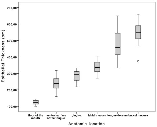 According to its location within the oral cavity, the epithelium showed a variable thickness. Details regarding measured sites are reported in Table 1. The highest and the thinnest values were observed, respectively, in the region of the buccal mucosa, −659.79 µm, and in the mouth’s floor, −100.07 µm. The difference in epithelial thickness between the different anatomical locations was statistically significant—p ≤ 0.05 (Figure 2). The healthy epithelium has a mean thickness of 335.59 ± 150.73 µm. There were no significant differences between the left and right side of the oral cavity, as the ANOVA analysis of the measurements per image underlined. Therefore, thanks to the repeated measurements, it is possible to exclude an interobserver variability in this study.