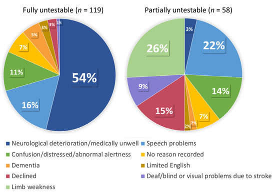 Patients were classified as fully untestable when no part of the assessment was attempted (decision made by researcher in consultation with parent clinical team) and/or when no questions were answered when testing was attempted. Partially untestable was defined when at least one item in a test could not be completed or was not attempted (decided by either the patient, parent clinical team or researcher). A list of potential categories was created by the authors based on clinical experience, previous literature and initial scoping of free text responses. The free text reasons documented for each patient classified as untestable by the individual assessor were later collated into categories (e.g., aphasia and dysarthria both captured under speech problems) by the lead author (E.Elliott) with discussion with the stroke consultant (T.Quinn). Where more than one reason was listed, we chose the primary factor deemed to have the greatest impact on assessment (e.g., a patient documented as both acutely confused and dysarthric was categorised under confusion). Cases where a test item was attempted but poorly completed, for example, a patient with limb weakness who attempted the clock-draw with their weak or non-dominant hand, were classed as testable.