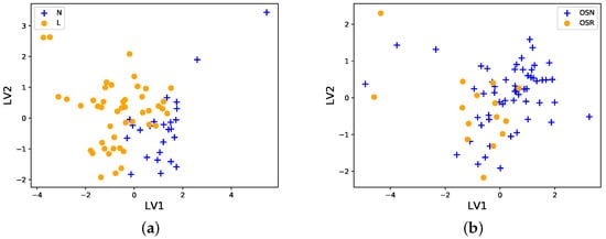 PLS-DA projections of the data onto two axes, latent variable 1 (LV1) and latent variable 2 (LV2). (a) The N (blue crosses) and L (yellow circles) groups do not overlap strongly, and hence are clearly different, but at the same time they are very close to each other with some overlap. (b) The OSN (blue crosses) and OSR (yellow circles) groups can be seen to be strongly overlapping, and hence not significantly different from each other. The data were log10 transformed, and centered and scaled before projection.