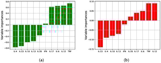 Figure 2a shows the signed variable importances obtained from the centroids, where positive signs/values indicate up-regulation of the cytokine in the L group relative to N, and negative signs/values indicate down-regulation. As can be seen, several of the cytokines are up/down-regulated in the different groups, and the magnitude of the difference varies between cytokines, i.e., not all cytokines are equally important in distinguishing the groups. It appears from the figure that the most important (by largest magnitude) cytokines distinguishing the groups are IL-4 (down), TNF-α (up), IL-23 (down), and IL-12 (up) with the other cytokines of slightly lesser consequence.