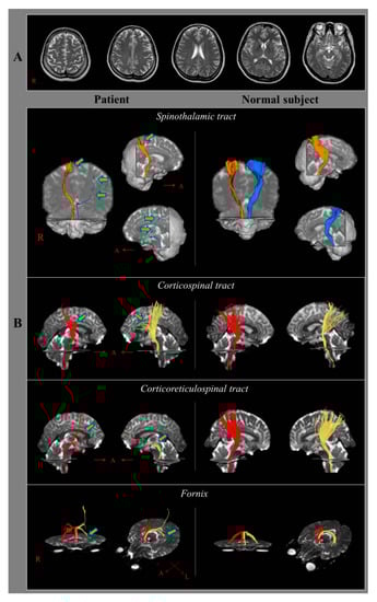 DTI data were acquired nine years after onset by using a sensitivity-encoding head coil on a 1.5 T Philips Gyroscan Intera (Hoffman-LaRoche, Best, Netherlands). For each of the 32 non-collinear diffusion sensitizing gradients, 70 contiguous slices were acquired parallel to the anterior commissure-posterior commissure line. Imaging parameters were as follows: Acquisition matrix = 96 × 96; reconstructed matrix = 192 × 192; field of view = 240 mm × 240 mm; TR = 10,726 ms; TE = 76 ms; parallel imaging reduction factor (SENSE factor) = 2; EPI factor = 49; b = 1000 s/mm2; NEX = 1; and 2.5 mm slice thickness with no gap. For assessment of the STT, the Oxford Centre for Functional Magnetic Resonance Imaging of the Brain (FMRIB) Software Library (www.fmrib.ox.ac.uk/fsl) was used to analyze the obtained DTI data. Affine multi-scale two-dimensional registration was used for correction of head motion effect and image distortion, due to eddy currents. Fiber tracking was performed by using a probabilistic tractography method based on a multi-fiber model and was applied in the current study by utilizing tractography routines implemented in FMRIB Diffusion software (5000 streamline samples, 0.5 mm step lengths, curvature threshold = 0.2). To examine the STT, the seed region of interest (ROI) was placed on the posterolateral medulla on an axial slice, and target ROIs were placed on the portion of the ventro-postero-lateral nucleus of the thalamus and the primary somatosensory cortex [15,21]. The threshold of two streamlines was applied to the results of fiber tracking for each tract. To reconstruct the corticospinal tract (CST) and corticoreticulospinal tract (CRT), fiber tracking was performed by using the fiber assignment continuous tracking algorithm implemented within DTI task card software (Philips Extended MR Work Space 2.6; Philips, Amsterdam, Netherlands) [15]. Each DTI replication was intra-registered to the baseline ‘b0’ images to correct for residual eddy-current image distortions and head motion effects by using a diffusion registration package (Philips Medical Systems; Philips, Amsterdam, Netherlands). For analysis of the CST, the seed ROI was placed on the anterior blue portion of the upper pons on the axial image of the color map, and the target ROI was placed on the anterior blue portion of the lower pons on the axial image of the color map. Regarding the reconstruction of the CRT, the seed ROI was placed on the reticular formation of the medulla, and the target ROI was placed on the tegmentum of the midbrain. Fiber tracking of the CST and CRT was performed by using a fractional anisotropy (FA) threshold of >0.15 and a direction threshold of <27°. In addition, for the reconstruction of the fornix, the seed ROI was placed at the junction between the body and column of the fornix, and target ROIs were placed on each side of the crus of the fornix [22]. Fiber tracking of fornix was performed by using an FA threshold of >0.2 and a direction threshold of <45°.
