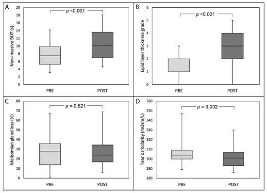 Tear osmolarity significantly decreased after treatment, in contrast with previous studies which conversely reported no changes of this parameter after treatment [,,]. Since tear osmolarity has been shown by the TFOS Dry Eye Workshop II to be influenced by both tear film stability and lipid layer characteristics [], the improvement of these two parameters after IRPL could explain this finding. However, it should be pointed out that in our study, as well as in other MGD populations, tear osmolarity values were within the upper range of normality [,,].