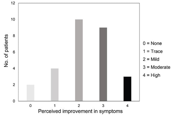 Thirty days after the last IRPL session, median NIBUT significantly increased from 7.5 s (IQR: 5.2, 95% CI: 7.0–8.5) to 10.2 s (IQR: 5.4, 95% CI: 9.5–11.4) (p <0.001; Figure 1, part A), and median LLT grade significantly improved from 2.0 (IQR: 1.0, 95% CI: 1.5–1.9) to 3.0 (IQR: 2.0, 95% CI: 2.6–3.3) (p <0.001, Figure 1, part B). No statistically significant changes were recorded after IRPL treatment for both MGL (Figure 1, part C) and OSDI score (always p >0.05). Median tear osmolarity significantly decreased after treatment from 304.0 mOsm/L (IQR: 9.8, 95% CI: 302.9–308.3) to 301.0 mOsm/L (IQR: 14.0, 95% CI: 298.1–303.2) (p = 0.002, Figure 1, part D). Twenty-six patients (92.9% of the total) showed an improvement of symptoms after treatment (median grade 2.0 (IQR: 2.0, 95% CI: 2.0–2.5)). Figure 2 shows the distribution of patients’ perceived improvement in symptoms according to the 5-grade scale used.