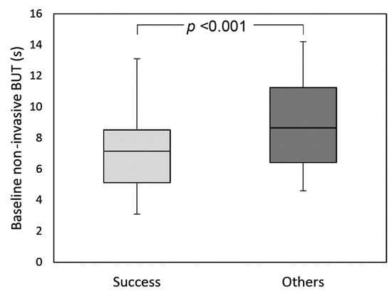 Box-plot analysis of baseline non-invasive break-up time in patients belonging to the success group and in the others.