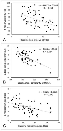 Linear regression analysis between baseline value and delta (Δ) value for non-invasive break-up time (part A), tear osmolarity (part B), and meibomian gland loss (part C).