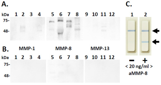 Western immunoblot analysis of diabetic periodontitis-affected (A) and systemically- and periodontally-healthy (B). Oral rinses for MMP-1 (Lanes 1–4), MMP-8 (Lanes 5–8), and MMP-13 (Lanes 9–12). Mobilities of the molecular weight markers (kDa) are indicated on the left. Negative (−, <20 ng/mL aMMP-8, Lane 1) and positive (+, ≥20 ng/mL aMMP-8, Lane 2) chair-side (PoC) lateral flowimmunotest outcomes are indicated by arrows on the right (C).