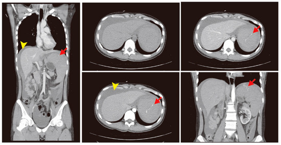The abdominal contrast enhanced computed tomography (CT) showed splenomegaly and a splenic rupture (red arrow) with hemoperitoneum (yellow arrow head).
