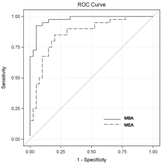In order to test the diagnostic accuracy of the two multiplex array platforms, 80 urine samples (cohort #2) were monitored for the 10 biomarkers, using both MEA and MBA. The subjects’ demographics and disease characteristics are summarized in Table 2. Urinary concentrations of 7 of the 10 biomarkers and 3 of the 10 biomarkers were elevated in patients with bladder cancer compared to controls in MEA and MBA, respectively (Table 3). Individual analysis of the ten biomarkers using optimal cutoff values defined by Youden index calculations resulted in the reported area under receiver operating characteristic (ROC) curve (AUROC) (Table 4). AUROC was significantly improved in MBA compared to the MEA for PAI1 (85% vs. 67%; 95% CI: 0.06–0.30; p = 0.004) and CA9 (80% vs. 53%; 95% CI: 0.11–0.43; p = 0.001). Furthermore, the combination of all ten biomarkers using optimal cutoff values defined by Youden index calculations resulted in an AUROC (Table 4 and Figure 1) of 97% for MBA and 86% for MEA (95% CI: 0.04–0.19; p = 0.003). The sensitivities and specificities for MBA were 0.93 and 0.95, respectively, and for MEA were 0.85 and 0.80. Accuracy, positive predictive values (PPV), and negative predictive values (NPV) for MBA were 0.94, 0.95, and 0.93, respectively, and for MEA were 0.83, 0.81, and 0.84, respectively.
