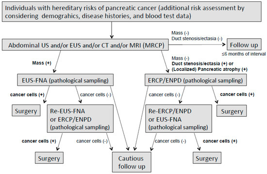 EUS-guided fine needle aspiration (EUS-FNA) and endoscopic retrograde cholangiopancreatography (ERCP) are useful in obtaining pathological evidence when abnormal findings are observed in surveillance images [73,74,75]. Hence, clinicians must be cautious about suspicious pancreatic findings, such as pancreatic masses, enhanced nodules, pancreatic duct stenosis/narrowing, and focal pancreatic atrophy [2].