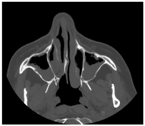 Axial scan of the facial massif where the polypoid formation is seen in both nostrils and maxillary sinuses.