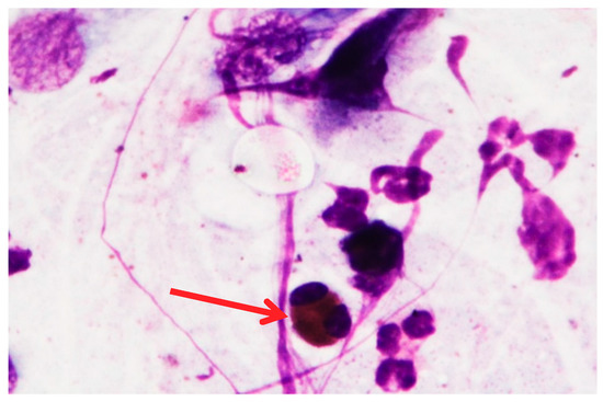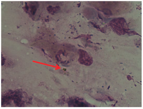 Optical microscope image. The red arrow shows the presence of masses indicating a suspected infection (100× image enlargement, oil immersion).
