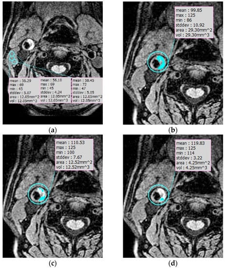IPH semiautomatic segmentation. (a) Measuring the signal intensity of three points in the sternocleidomastoid muscle (SCM) to calculate the mean signal intensity of SCM. (b–d) IPH detection and volume were measured by the area that showed signal intensity of >150% (b), >175% (c), and >200% (d) of the mean intensity of the SCM.
