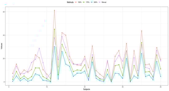 The ICC value of manual vs. 150% criteria and manual vs. 175% criteria were significantly better than that of manual vs. 200% criteria (p < 0.001) (Figure 3).