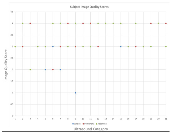 A total of 21 nonmedically trained undergraduate students without prior ultrasound experience were recruited and completed the study. The average time to complete the specific exams was as follows: cardiac exam, mean = 4.7 (standard deviation (SD) = 3.6 min); pulmonary exam, mean = 1.6 (SD = 1.2 min); abdominal exam, mean = 2.1 (SD = 1.6 min). The average total time for the exam was 8.5 min (SD = 4.6). A comparison between the live expert examiner and the blinded postexam reviewer showed a 100% agreement between image interpretations. A review of the exams rated as three or greater demonstrated that 87% of abdominal, 90% of cardiac, and 95% of pulmonary exams achieved this level of image quality (Figure 2). The complete distribution of the image quality results for each exam type is shown in Figure 3. Standardized patient comfort survey results showed 5/5 scores for all ultrasound examinations. Summary data from the satisfaction survey of the teleultrasound communication by the novice users was as follows on a 5-point Likert scale: audio quality, median = 3.0 (interquartile range (IQR) = 2); ease of following commands, median = 5 (IQR = 1); comfort in obtaining cardiac view, median = 5 (IQR = 1); comfort in obtaining lung view, median = 5 (IQR = 1); and comfort in obtaining abdominal view, median = 4 (IQR = 1).