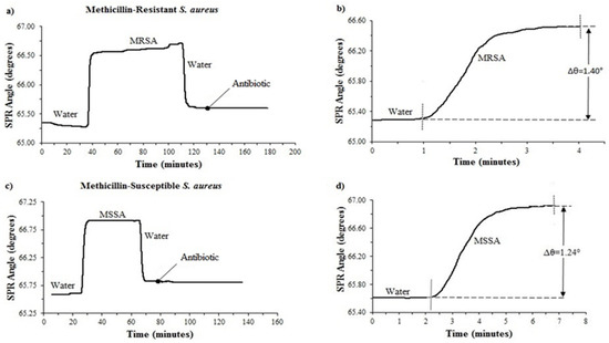 - Tawil, N.; Sacher, E.; Mandeville, R.; Meunier, M. Surface plasmon resonance detection of E. coli and methicillin-resistant S. aureus using bacteriophages. Biosens. Bioelectron. 2012, 37, 24–29. [Google Scholar] [CrossRef]