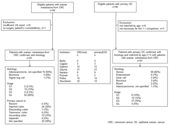 In total, 81 patients with ovarian mCRC and 81 with primary OC were identified from eight institutions (seven oncology centers). Details of patient characteristics and ultrasound parameters are presented in Table 1, Table 3, and Figure 1.