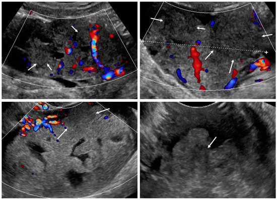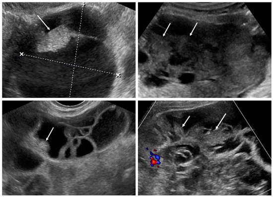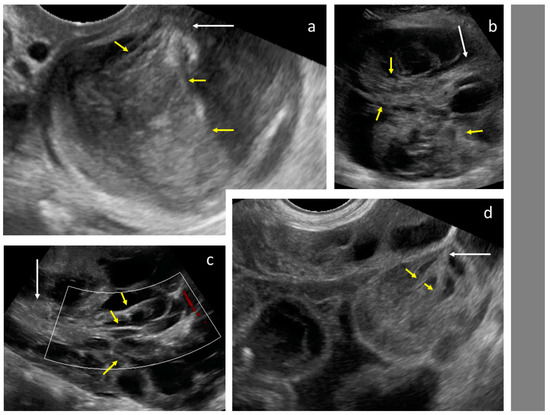 - Zikan, M.; Fischerova, D.; Pinkavova, I.; Dundr, P.; Cibula, D. Ultrasonographic appearance of metastatic non-gynecological pelvic tumors. Ultrasound Obstet. Gynecol. 2012, 39, 215–225. [Google Scholar] [CrossRef] [PubMed]