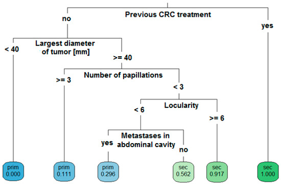 A classification and regression tree (CART; decision trees) procedure for the differentiation of ovarian mCRC from primary OC was proposed. CART is a graphic method for supporting the decision-making process, which can be used for different types of modeled variables, i.e., continuous or discrete. The goal is to create a model that predicts the value of a target variable based on several input variables [17,18]. The main task of the CART method is to generate mutually exclusive regions in which as many samples as possible are classified into one group. These regions are created by successive divisions of the training set using binary logic rules [19]. The learning process is carried out to obtain the most homogeneous group of sample sets (Figure S2). As an algorithm output, CART can provide two types of information: the description of which group the examined object is located in, or the probability of belonging to a given group [20]. The main advantage of using decision trees is that they are nonparametric methods. An additional advantage is the automatic identification of the most significant variables by the algorithm and the elimination of statistically insignificant variables. Among the disadvantages, notably, a slight modification of the training set (e.g., removal of several observations, change of variables thresholds) can radically change the structure of the tree. In addition, in each step, the tree can divide the space only in relation to one variable (in other words, the dividing lines are always perpendicular to the divided axis in the variable space) [21].