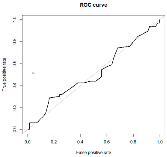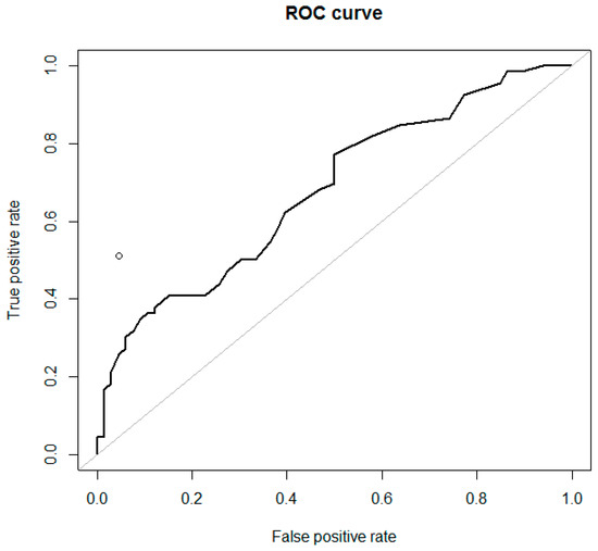 The optimal decision tree was developed and validated using data from 162 patients, randomly divided into training (80%) and test (20%) sets. At input, all clinical and ultrasound data were used except cancer markers. The resulting tree is shown in Figure 6. For example, a patient with an adnexal mass who underwent CRC treatment in the past should be directly suspected of having a metastatic tumor (irrespective of ovarian tumor sonographic features). A patient without CRC in anamnesis who has a tumor of <40 mm should be suspected of having primary OC (0% risk of mCRC). A patient with an ovarian tumor of ≥40 mm with more than three papillations has an 88.9% probability of primary OC and an 11.1% risk of mCRC. A patient with a tumor of ≥40 mm, <3 papillations, and ≥6 locules has a 91.7% probability of having an ovarian mCRC, while those with <6 locules and metastases detected in the abdominal cavity should rather be suspected of having primary OC, although the risk of metastatic cancer remains at 29.6%. The AUC of this decision tree was 0.768.