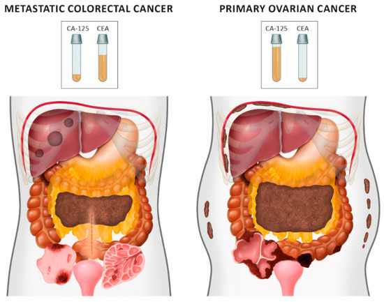 Ovarian tumors may be suspected to be of gastrointestinal origin, particularly when the CA-125 U/mL/CEA ng/mL ratio is ≤25 [29]. More et al. studied it in greater detail—in a subset of patients with multilocular and multilocular-solid tumors (based on ultrasound), the best cut-off values for CEA alone and the CA-125/CEA ratio for discrimination between ovarian primary (including benign and malignant) and metastatic tumors were 2.3 and 11.9, respectively [11].