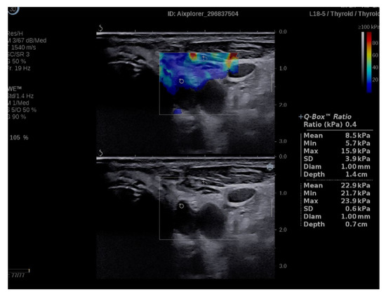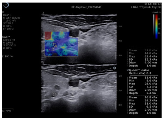 The correct identification of parathyroid lesions, in cases with coexistence of thyroid lesions, is still a task for clinicians. Shear wave elastography is used to quantify tissue elasticity by evaluating shear wave attenuation. Shear waves are vibrations induced by acoustic radiation force through a focused ultrasound beam, making it a more operator-independent technique [36,37,38]. By analyzing the particle displacements with an ultrafast ultrasound acquisition sequence, quantitative measurements of tissue elasticity can be obtained [36]. Evaluation of the elasticity characteristics of the tissue can help in identifying special types of tissues [39]