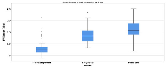ANOVA test demonstrated a statistically significant difference for SWE-mean of parathyroid, thyroid, and muscle. Post-hoc analysis with Tukey test was conducted. Referring to parathyroid SWE, we observed statistically significant difference compared with the healthy thyroid SWE (−5.945, p < 0.001) and with the same-sided muscle (−7.953, p < 0.001) (Figure 4).