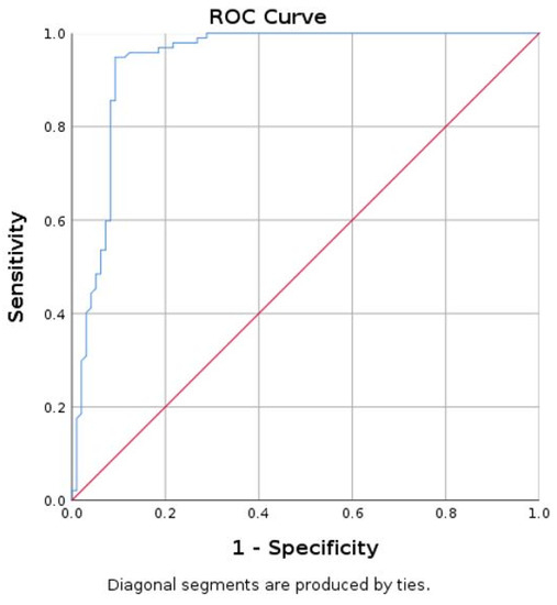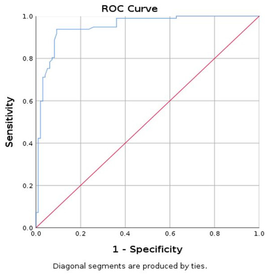 When comparing the two SWE ratios, we obtained significant differences, using statistic test T, between the two groups (p = 0.001); however, ROC curve does not apply (Figure 7) because we cannot make a clear demarcation between the two, as the values are so close to one another (Figure 8).