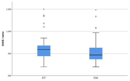 SWE ratio parathyroid tissue/thyroid tissue (P/T) and SWE ratio parathyroid tissue/muscle tissue (P/M).