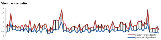 SWE ratio for parathyroid/muscle and parathyroid/thyroid values—compared values using stacked chart line.