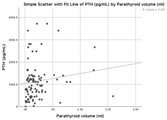 In patients with CKD, on RRT therapy, chronic stimulation of the parathyroid glands triggers diffuse polyclonal hyperplasia [1]. We compared the parathyroid volumes from our patients with the PTH serum concentration and did not find any significant correlation (r = 0.145, p = 0.158) between the two entities (Figure 9).