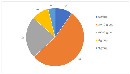 The first dataset used in this study is a collection of 104 samples and their TPM values. Stated as a classification problem, this study designates five classes obtained from joint Gleason groups. The distribution of each group is shown in Figure 1. The dataset was mapped against the human genome version hg19 with 88% to 99% uniquely aligned reads. Throughout a 10-fold cross-validation model, we obtained a total of seven samples that were misclassified and another 97 samples that were classified correctly, with the total number of samples being 104. The accuracy of the model was calculated from the total number of correctly classified samples divided by the total number of samples.