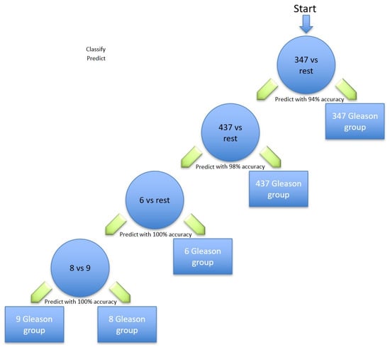 Hierarchical tree of classifications of Gleason groups against the rest, along with the corresponding classification accuracies.