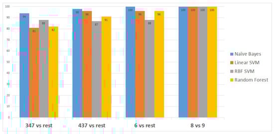 Naïve Bayes outperformed the other classifiers, as it distinguished the first Gleason score node from the rest with 94% accuracy, the second node with a higher accuracy of 98%, and the last two Gleason score nodes with 100% accuracy, as shown in Figure 3.