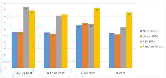 Accuracy obtained by each classifier for classifying one versus the rest for all five Gleason groups.