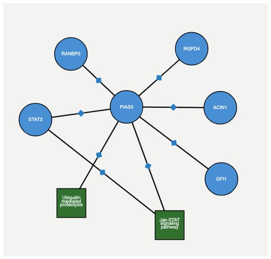 PIAS3 is a member of the mammalian PIAS family consisting of four members: PIAS1, PIAS2, PIAS3, and PIAS4 [27]. PIAS3 protein directly binds to several transcription factors and either blocks or enhances their activity. PIAS3 is also specific inhibitor of signal transducer and activator of transcription 3 (STAT3), a transcription factor and member of the Janus kinase (JAK)/STAT signaling pathway [28,29]. This signaling pathway has been a target of interest in many cancer studies in recent years. In prostate cancer, the expression levels of JAK/STAT have been shown to impact the progression of the disease [30,31]. As an inhibitor of STAT3, PIAS3 blocks the transactivation and binding of STAT3 to specific DNA elements via protein–protein interactions, thereby inhibiting STAT3-mediated gene activation. Figure 5 depicts the protein–protein interaction among genes with 4 + 3 = 7 and 6 scores, as extracted from ProteomicsDB (https://www.proteomicsdb.org/proteomicsdb/#human/proteinDetails/86810/interactions) based on experimental and epidemiological evidence. The Figure shows that both PIAS3 and UBE2V2 share the same protein interaction network.