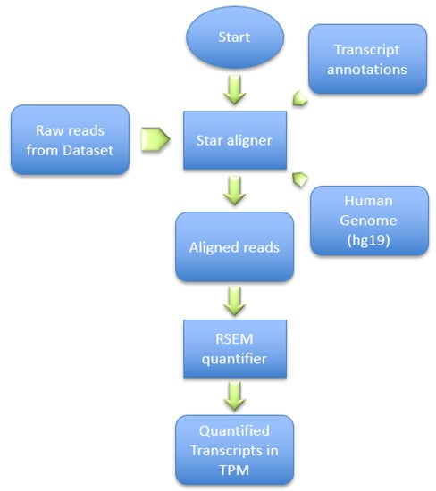 This dataset was generated by using the Illumina HiSeq 2000 NGS on paired-end sequences of length 51 bp each. The pre-processing pipeline model starts by obtaining the RNA-Seq samples and pre-processing it using SRAtools [41], as depicted in Figure 6. The process continues by incorporating the STAR aligner [8] to align the samples reads into the human genome (hg19). Then, the process assembles the transcripts and quantifies the reads into the assembled transcripts using RSEM [42]. RSEM uses transcripts per million of reads (TPM) to compute the quantification of each read into a transcript.
