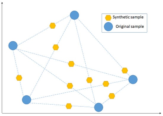 NCL works by removing any sample whose class is different from the class of at least two of its three nearest neighbours. SMOTE, instead, introduces a new way of creating new samples, by utilising the feature vector that connects each sample and introduces a new synthetic sample along the line that connects the two underlying samples. The exact location of the new sample on the line itself is calculated by measuring the Euclidean distance between the two samples and multiplying that value by a random number between 0 and 1. Figure 7 shows a hypothetical example of the mechanism followed by SMOTE, by adding new synthetic samples randomly along the line that connects each of two original samples in a minority class. The blue points represent the original samples, while the amber points represent the synthetically generated samples.
