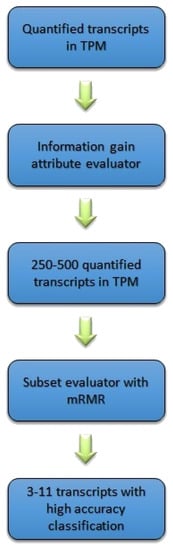 As the output of the pre-processing step, the method retrieved 41,971 transcripts along with their corresponding quantifications measured by TPM. Such a large number of transcripts leads to a complex classification model, mostly due to the curse of dimensionality [48]. Thus, feature selection was applied to reduce the dimensionality of the problem. The first step of the feature selection step is to filter the transcripts based on their information gain values by selecting the ones with the highest scores. The filter method, which is called attribute evaluator, is the procedure by which each attribute (transcript) in the dataset is assessed with regard to the class. This procedure produces a list of attributes (transcripts) with a score for each attribute showing its effect on the actual class. Then, the attributes with the highest scores are selected, discarding those with lower scores. In this work, information gain (IG) was used as an attribute evaluator to rank each attribute vector [49]. The IG of attribute vector X concerning class vector A is defined as follows: