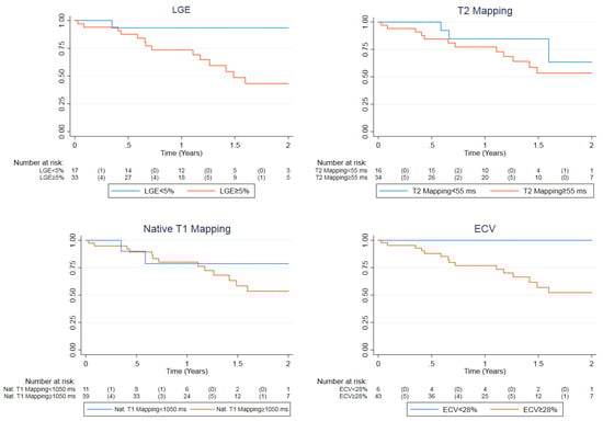 During a median follow-up period of 1.23 (0.71–2.00) years, 13 (41.9%) of the 31 patients in the event group reached the combined endpoint by experiencing either ventricular tachycardia (5/13), sudden cardiac death (2/13), heart failure (7/13) or pulmonary hypertension (2/13), while in the no-event group only two (10.5%) of the 19 patients experienced adverse events, those being atrial arrhythmias. Univariable Cox regression analyses demonstrated that biventricular volumes and ejection fractions, LV mass, LGE and ECV at baseline were all significant predictors of the combined endpoint (Table 3). These remained significant after multivariable correction for age, sex and disease duration. Trends towards significance were identified in univariable analyses of T2 mapping and native T1 mapping (p = 0.071 and 0.082 respectively). However, these became significant predictors when corrected for age, sex and disease duration (Table 3). All results remained significant after application of Benjamini–Hochberg corrections for multiple comparisons. Because LGE, T2 mapping and native T1 mapping were the only variables that could both independently discriminate between the two groups at baseline as well as being significant predictors of adverse outcomes, we generated Kaplan–Meier curves with normal cut-off values used locally at our institution. ECV was also incorporated to this selection as it was marginally non-significant in logistic regression analysis and significant in Cox regression analysis. All plots are displayed in Figure 1. Of these four, by using the locally established cut-offs of our center (LGE < 5%, T2 mapping < 55 ms, native T1 mapping < 1050 ms and ECV < 28%), LGE and ECV had the best predictive capacity for the combined endpoint. Notably, patients with a diffuse subendocardial LGE pattern had the most ominous prognosis (two experienced sudden death and two rapid evolution to heart failure). However, although the log rank test for LGE was significant (p = 0.022), this was not the case for ECV (p = 0.144).