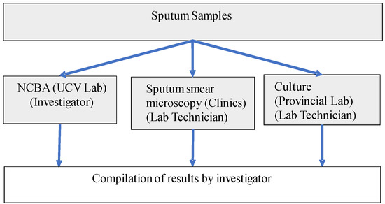 A total of 1108 sputum samples from patients symptomatic of respiratory TB [36] were used in this study. These samples were collected in sterile screw-capped containers from patients who went to 9 health clinics in the La Libertad region of Peru. There were no samples from contacts or asymptomatic patients of TB or unrelated to TB. All samples were subjected to the 3 TB detection methods: SSM, NCBA, and culture as shown in Figure 1. SSM was conducted at the health clinics. Aliquots of the samples were sent to the Provincial Laboratory in Trujillo City for standard culture on Lowenstein Jensen medium. Aliquots of the samples were also sent to the Microbiology Lab at the Universidad Cesar Vallejo (UCV) for NCBA testing. All patient-related information was removed and the samples were decoded and randomized to non-linked codes prior to sending the samples to UCV. Samples were stored at 4 °C upon receipt and processed immediately or within 24 h.