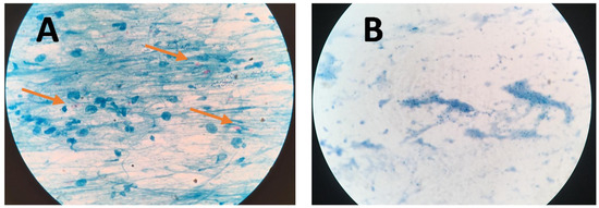 Microscope images of sputum smear microscopy (SSM) for (A) TB positive sample showing dispersed red bacilli (pointed by arrows) and (B) TB negative samples.