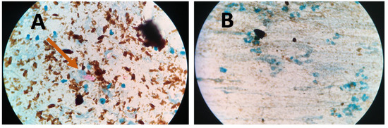 Figure 4 presents bright-field microscope images of acid-fast bacilli (AFB) of Mtb using SSM in TB positive sample showing scant and highly dispersed red AFB (Figure 4A) and in TB negative sample showing no red AFB (Figure 4B). Figure 5 presents bright-field microscope images of AFB using NCBA. Figure 5A shows red clumps of AFB in TB positive samples with distinct characteristics: clumped red rods surrounded by brown nanoparticles. In TB negative samples (Figure 5B), the microscope image shows dispersed brown nanoparticles. Exposure to GMNP and magnetic field did not seem to affect the staining of AFB. A study to determine the direct effect of GMNP was conducted by using the same TB positive sputum sample and subjected to NCBA and SSM. Figure 6 shows bright-field microscope images of the TB positive sample subjected to both NCBA (Figure 6A) and SSM (Figure 6B). The images show that the GMNP aggregates and concentrates the AFB when using NCBA (Figure 6A); the same sample registered negative (no visible red AFB) when using SSM (Figure 6B). Our previous study showed that NCBA increased AFB count by 47% compared to SSM [33].